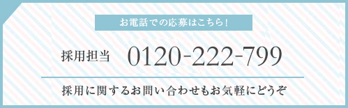 | 待遇 | 昇給随時(当社ランクアップシステムにより決定) / 賞与年1回 / 雇用保険、労災保険、傷害保険加入 / 制服入社時支給 / 海外研修制度有 / 独立支援制度 / 産休・育休制度(取得実績多数) / 社内保育園(保育料優遇)※一部エリア |